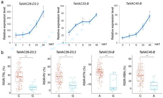 According to the RNA-seq results, we selected three NAC genes that were continuously upregulated after salt stress, including TaNAC26-D3.2, TaNAC33-B, and TaNAC40-B, and the further RT-qPCR experiments have shown consistent results (Figure 5a). Furthermore, these three genes were associated with root salt tolerance phenotypes based on association analysis (Figure 5b, Table S5). SNP 0779[A/G], located in exon 3 of TaNAC26-D3.2, caused a synonymous mutation and involved RSIR-TRL and RSIR-RV; SNP 4718[G/T] was located in intron 3 of TaNAC33-B and was related to RSIR-RTN; and SNP 5088[T/C], located in intron 4 of TaNAC40-B, was correlated with RSIR-RBN.