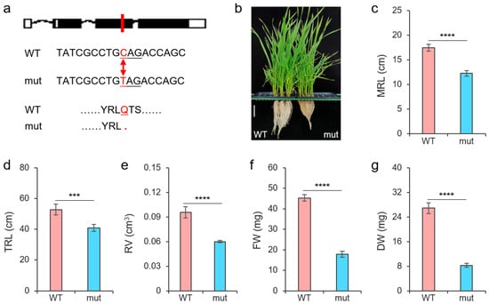 To verify the effect of TaNAC26-D3.2 on salt tolerance in wheat, we identified a mutant line with a C to T mutation in its exon 2, which produced a premature stop codon and led to a truncated protein (Figure 6a), to observe changes in roots after salt stress. As expected, we observed the decreased root length of the tanac26-d3.2 mutant compared to the wild type after treatment (Figure 6b). Both the maximum root length (MRL) and the TRL of the mutant were shorter than that of the wild type (Figure 6c,d). Moreover, compared with the wild type, the tanac26-d3.2 mutant roots showed less volume and reduced biomass after being subjected to salt stress (Figure 6e–g). This result suggested that TaNAC26-D3.2 positively regulated the salt tolerance of plants.