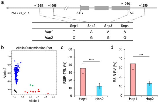 Haplotypes of TaNAC26-D3.2. (a) Location of four SNPs in the gene. The gray box indicates an exon. (b) Genotyping result of KASP marker K3 in 114 wheat germplasms. (c,d) Phenotypic differences in RSIR-TRL and RSIR-RV between Hap1 and Hap2. *** indicates p < 0.001, and **** indicates p < 0.0001, according to the t-test.