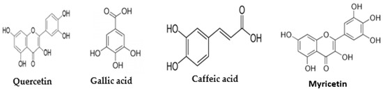| Sample | Myricetin (mg.g−1) | Caffeic Acid (mg.g−1) | Gallic Acid (mg.g−1) | Quercetin (mg.g−1) |