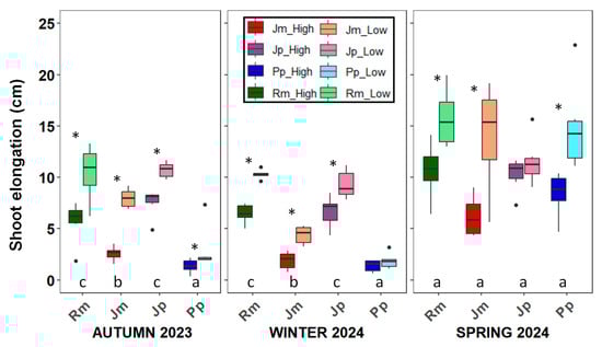 Seasonal shoot elongation (mean ± SD) for the four study species growing in the low and high zones during the growing season from autumn to spring. Boxplots show the median, interquartile range, and potential outliers. Asterisks indicate significant differences between the low and high zones (p < 0.05). Different letters denote significant differences among species within each season according to Tukey’s post hoc test. Rm: Retama monosperma; Jm: Juniperus macrocarpa; Jp: J. phoenicea; Pp: Pinus pinea.