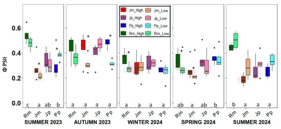 Seasonal variation in the effective photochemical efficiency (ΦPSII) across the five sampling campaigns for the four study species. Boxplots show the median, interquartile range, and potential outliers. Asterisks indicate significant differences between the low and high zones (p < 0.05). Different letters denote significant differences among species within each season according to Tukey’s post hoc test. Rm: Retama monosperma; Jm: Juniperus macrocarpa; Jp: J. phoenicea; Pp: Pinus pinea.