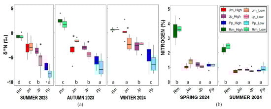 (a) Nitrogen isotopic composition (δ15N) and (b) foliar nitrogen content (%N) for the four studied species in the low and high zones. Boxplots show the median, interquartile range, and potential outliers. Asterisks indicate significant differences between zones (p < 0.05). Letters indicate significant differences among species and zones according to Tukey’s and Kruskal-Wallis tests (p < 0.05). Rm: Retama monosperma; Jm: Juniperus macrocarpa; Jp: J. phoenicea; Pp: Pinus pinea.