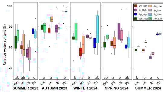 Seasonal variation in relative water content (%) across the five sampling campaigns for the four species under study. Boxplots show the median, interquartile range, and potential outliers. Asterisks indicate significant differences between the low and high zones (p < 0.05). Different letters denote significant differences among species within each season, according to Tukey’s post-hoc test. (p < 0.05). Rm: Retama monosperma; Jm: Juniperus macrocarpa; Jp: J. phoenicea; Pp: Pinus pinea.