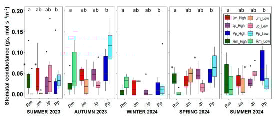 Seasonal variation in stomatal conductance across the five sampling campaigns for the four study species. Boxplots show the median, interquartile range, and potential outliers. Asterisks indicate significant differences between the low and high zones (p < 0.05). Different letters denote significant differences among species within each season according to Tukey’s post hoc test. (p < 0.05). Rm: Retama monosperma; Jm: Juniperus macrocarpa; Jp: J. phoenicea; Pp: Pinus pinea.