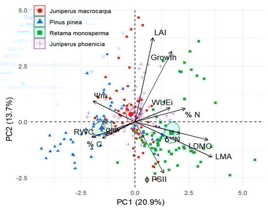 Principal component ordination biplot of morpho-physiological traits measured in the four study species (Pinus pinea, Juniperus macrocarpa, J. phoenicea, and Retama monosperma) across the wet and dry seasons. Arrows indicate the direction and strength (loading) of the variables contributing to each axis. Species are represented by ellipses encompassing 95% confidence intervals around the group centroids. Abbreviations of variables and loading factors are shown in Table A4).