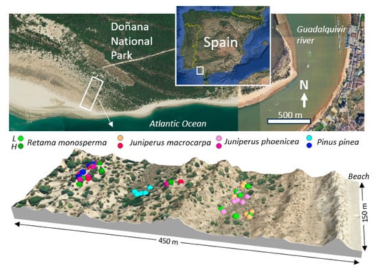 The study was conducted in a coastal dune system south of Doñana National Park (SW Spain), near the mouth of the Guadalquivir River (Huelva; ~36.785°N, 6.396°W). The area was newly created, formed over the last 80 years, as a result of beach progradation and the successive formation of dune ridges separated by depressed areas (Figure A1). The climate is Mediterranean sub-humid (Csa), with a mean annual precipitation of 523 mm and a pronounced summer drought, as most rainfall occurs between October and May. The mean annual temperature was 18.7 °C, ranging from 11.7 °C in the coldest month to 26.5 °C in the warmest month. As the area has formed, a process of primary succession has taken place and continues to be active. The woody vegetation is dominated by the shrub R. monosperma and the tree species P. pinea, J. phoenicea, and J. macrocarpa. The ecological functioning of these dune systems is strongly influenced by groundwater depth, seasonal drought, and anthropogenic pressures [65,66,67], making them particularly vulnerable to climate change and hydrological alterations.