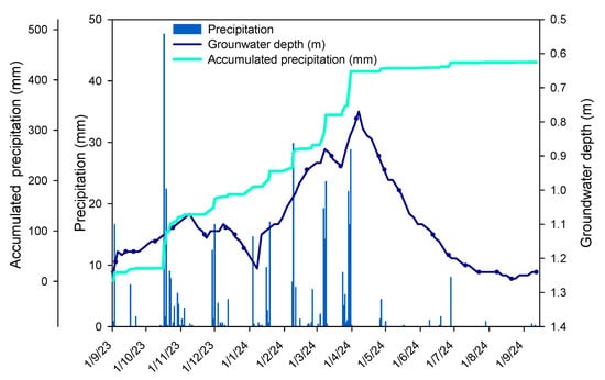 Two study zones with contrasting water availability were selected within the coastal dune system (Figure 8): a low zone, located behind the first and second dune ridges and closer to the water table (0.90 m during the humid period to 1.26 m in summer; Figure 9), and a high zone, situated on the third dune ridge, where groundwater is substantially deeper (4 to 6 m). At each site, six healthy, adult, and isolated individuals of each species (R. monosperma, J. phoenicea, J. macrocarpa, and P. pinea) were tagged and monitored seasonally from September 2023 to September 2024: A total of 48 individuals were studied (4 species × 2 zones × 6 individuals), ensuring consistent physiological measurements across the study period.