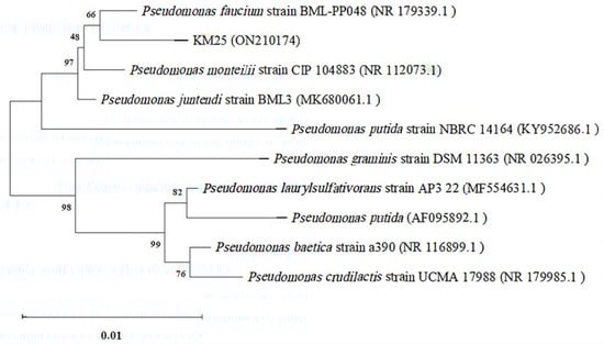 The phylogenetic tree was constructed based on 16S rRNA gene sequences using the neighbor-joining method. Numbers on branches indicate bootstrap support values from 1000 replications. Evolutionary distances were computed using the Kimura 2-parameter model, and the scale bar represents 0.01 substitutions per nucleotide position. Strain KM25, isolated in this study (GenBank accession number: ON210174), is marked with sequences of other reference strains retrieved from GenBank, with their accession numbers shown in parentheses.