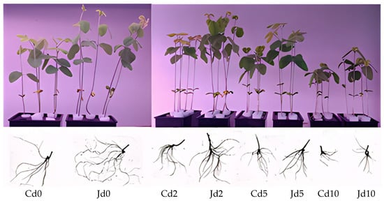 The growth conditions of soybean seedlings at different Cd concentrations; Cd0, Cd2, Cd5, and Cd10 indicate that the concentrations of CdCl2 in the seedling culture solution are 0, 2, 5, and 10 μg/mL, respectively. Jd0, Jd2, Jd5, and Jd10 indicate that 0, 2, 5, and 10 μg/mL of CdCl2, as well as 5% of KM25, were added to the culture solution, respectively.