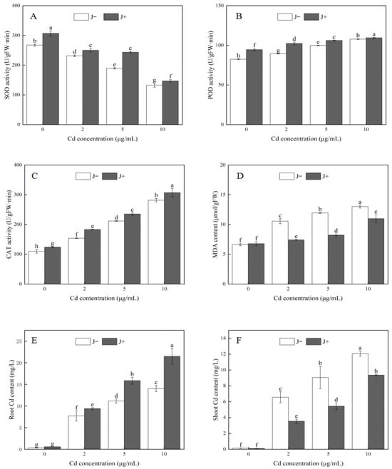 Strains KM25 (J+) and uninoculated (J−) of (A) (SOD), (B) (POD), (C) (CAT), (D) (MDA), (E) (root Cd content), and (F) (shoot Cd content). Each data point is the mean of three replicates. Error bars represent standard errors. Different letters indicate significant differences at p < 0.05.