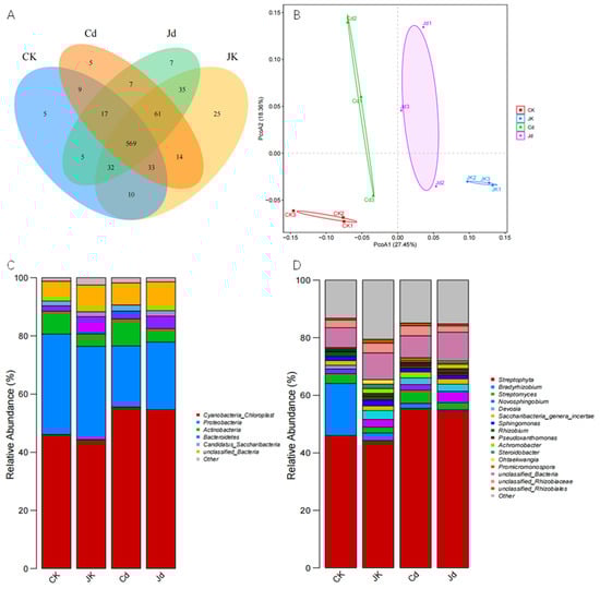 Given that strain KM25 may influence Cd accumulation and plant responses through interactions with the endophytic microbiota, we further analyzed the structure of the endophytic bacterial community in soybean roots under different treatments. At a similarity of 97%, the sequences were clustered into OTUs (Operational Taxonomic Units), as shown in (Figure 4A). CK and Cd represent seedlings treated with Cd solutions at concentrations of 0 μg/mL and 10 μg/mL, respectively. JK and Jd represent seedlings treated with 0 μg/mL + 25 mL of KM25 fermentation broth (OD600 = 1, approximately 1 × 109 CFU/mL, accounting for 5%) and 10 μg/mL Cd solution + 25 mL of LB liquid medium, respectively. A total of 834 OTUs were obtained through cluster analysis, with CK, Cd, Jd, and JK having 680, 715, 779, and 733 OTUs, respectively. Among them, 569 core OTUs were included. The four different treatment groups contained 5, 5, 25, and 7 unique OTUs, respectively. In the four different treatments, no significant differences were observed in the distribution richness (Chao, Ace), community diversity (Shannon, Simpson), and evenness (Shannon even) of the endophytic bacterial communities in soybean roots (Table 3). The Bray–Curtis-based principal coordinate analysis (PCoA) was conducted on the endophytic bacterial communities in roots (Figure 4B). The results indicated that PCoA1 and PCoA2 explained 27.45% and 18.36% of the variation in the endophytic bacterial communities in roots, respectively. There were significant differences among the endophytic bacterial communities in the four different treatments (Figure 4B).