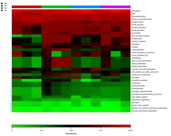 The functional differences in endophytic bacteria in the roots of soybean plants under different treatments were compared using the database FAPROTAX. Compared with the CK and Cd groups, after inoculation with strain KM25, the relative abundance of bacteria with functions such as nitrate reduction, nitrogen respiration, nitrate respiration, dark hydrogen oxidation, methanol oxidation, and aromatic hydrocarbon degradation increased (Figure 5).