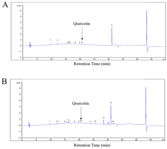 To characterize the chemical composition of C. obtusa bark extracts, fingerprint analysis was performed using high-performance liquid chromatography (HPLC). Chromatograms of both COWB and COEB were obtained, showing distinct chemical profiles (Figure 1A,B). Based on previous findings that tree bark, including that of C. obtusa, is rich in flavonoids such as quercetin [23], quercetin was selected as a standard marker compound for HPLC analysis (Supplementary Figure S1). Quantitative analysis revealed the presence of quercetin in both extracts, with a slightly higher content detected in COEB. This observation aligns with earlier reports that 70% ethanol is an effective solvent for extracting polyphenols and flavonoids from plant materials because of its intermediate polarity [29].