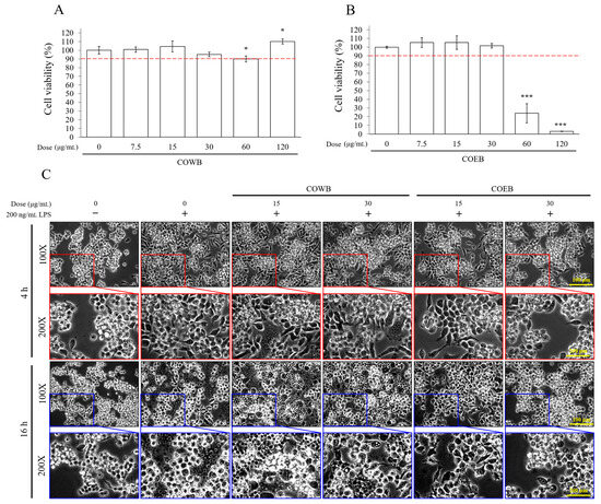 Cell cytotoxicity and morphologic change by COWB and COEB in RAW264.7 cells. (A,B) Cells were seeded into 96-well plates and treated with COWB (A) or COEB (B) for 24 h. Cell viability was assessed using the MTT assay. The red dotted line indicates 90% cell viability. (C) Cells were seeded into 6-well plates, pre-treated with COWB or COEB for 2 h, and then stimulated with LPS for 16 h. All data are presented as mean ± SD (n = 3). Statistical significance was determined using an unpaired Student’s t-test. p < 0.05 = *, p < 0.001 = ***.
