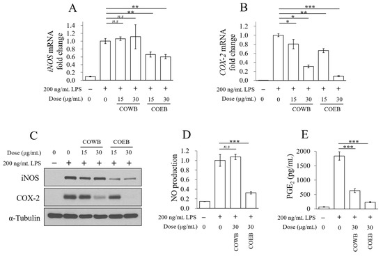 Comparison of anti-inflammatory effects of COWB and COEB in LPS-stimulated RAW264.7 cells. (A–E) Cells were seeded in 6-well plates, pre-treated with COWB or COEB for 2 h, and then stimulated with LPS for 16 h. (A,B) mRNA expression levels of iNOS (A) and COX-2 (B) were evaluated by qPCR. C. Protein expression levels of iNOS and COX-2 were analyzed by Western blotting. (D,E) Production of NO (D) and PGE2 (E) was measured using the Griess reagent and a PGE2 ELISA kit, respectively. All data are presented as mean ± SD (n = 3). Statistical significance was determined using an unpaired Student’s t-test. p < 0.05 = *, p < 0.01 = **, and p < 0.001 = ***. n.s. = not significant.