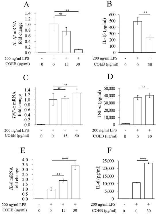 Cytokine production analysis was conducted according to the manufacturer’s instructions (https://www.abbkine.com 17 July 2025). Briefly, cells were seeded in 6-well plates and incubated overnight in a humidified CO2 incubator (PHCbi). On the following day, the cells were pre-treated with COEB for 2 h, followed by stimulation with LPS for 8 h. The levels of IL-1β and TNF-α in the collected supernatant were measured by ELISA using commercial kits (Abbkine).