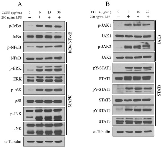 The anti-inflammatory effects of COEB are independent of NF-κB, MAPK, and JAK/STAT signaling pathways. (A,B) Cells were seeded in 6-well plates and pre-treated with COWB and COEB for 2 h, then treated with LPS for 4 h. Activation of Iκ-Bα/NF-κB ((A), top panel), MAPK ((A), bottom panel), and JAK/STAT (B) signaling pathways was analyzed by Western blotting.