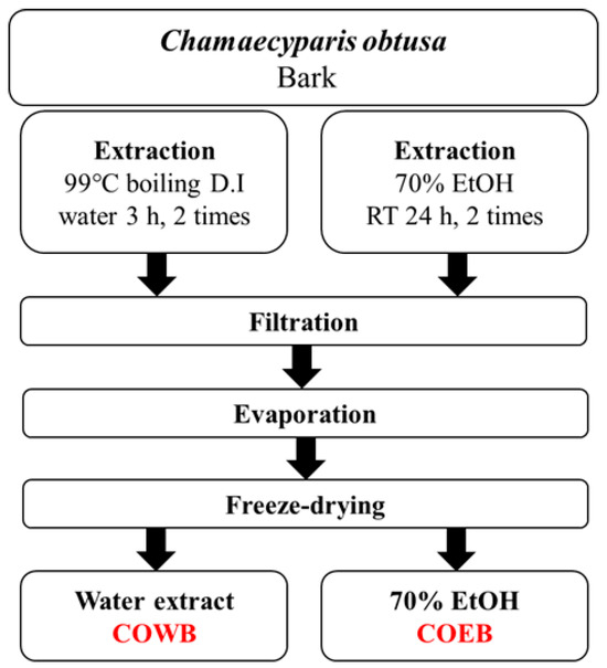 The C. obtusa used in this study was obtained from the same source as in our previous research [17,19]. Briefly, the C. obtusa samples used in this study were collected from Gwangyang-eup, Gwangyang-si, and Jeollanam-do, Republic of Korea, in March 2020. For the comparative analysis of C. obtusa bark extracts based on extraction methods, two types of samples were prepared: a boiling water extract (COWB) obtained by 99 °C boiling C. obtusa bark, and a 70% ethanol extract (COEB) obtained by soaking the bark in 70% ethanol. After extraction, each sample was filtered and passed through a filtration system. The filtrates were then concentrated and freeze-dried to obtain the final powdered extracts. The extraction yield of COWB was 3.44%, whereas that of COEB was 5.73%. The overall extraction process is summarized in Figure 6.