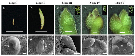 Developmental stages of buds in C. oleifera. Buds (a,b) are referred to the vegetative bud formed in the last year. Buds in stages I are distinguished as follows: (a) developed into sprouted buds (b); only vegetative buds grown (f,g); no flower buds occurred in stages I and II. Buds (c–e) in stages III, IV, and V were the apical buds of spring shoots (panel c–e), which were developed from a vegetative bud (b). Flower buds (h–j) in III, IV, and V were located at the base of apical buds (c–e). lp: Leaf primordium; fp: floral primordium; l: leaf, s: sepal; p: petal. The scale bars in a to b, in c to e, and in f to j indicate 1.5 cm, 1000 μm, and 50 μm, respectively.