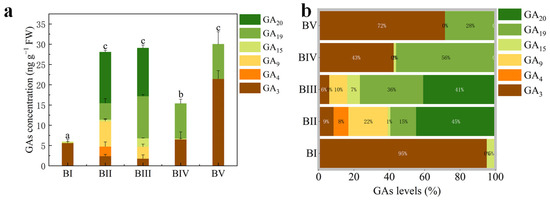 Concentrations of endogenous gibberellin types (a) and their relative proportions (b) at different developmental stages. The letters on the top of column indicate the multiple comparison results of total GAs concentration at 0.05 level.