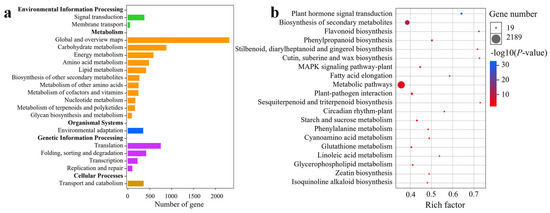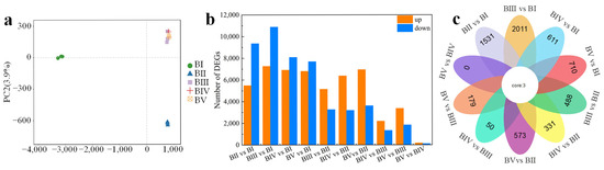 Principal component analysis revealed that the 15 samples could be grouped into 3 clusters: BI, BII, and BIII–V (Figure 3a). Samples from stages BIII, BIV, and BV were clustered together, suggesting similar transcriptomic profiles. Transcript annotation was conducted using BLASTx (version 2.2.2.1) against several protein databases—NCBI non-redundant (Nr), Swiss-Prot, Clusters of Orthologous Groups, Gene Ontology (GO), and Kyoto Encyclopedia of Genes and Genomes (KEGG)—with an E-value threshold of 10−5. A total of 27468 unigenes were annotated across all databases, while 60632 unigenes (79.7%) were annotated in at least one database.