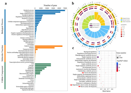 GO functional of the significantly differentially expressed genes (DEGs) in diverse pairwise comparisons (a). Top 20 significance-level GO terms of DEGs (b). Top 21 significance-level GO terms of BP (c). The red arrow indicates the GO term related to floral initiation.