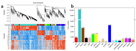 To gain a comprehensive understanding of gene expression throughout the developmental stages of floral initiation and petal differentiation—and to identify key genes associated with floral initiation—a WGCNA was performed. From the 26,996 DEGs identified across the 10 comparisons, genes with low variation (MDA < 0.1) or excessive missing data (>10% samples) were filtered out. Ultimately, 25,267 genes with non-zero variance were retained. A co-expression network was constructed based on pairwise correlations of gene expression across samples. Highly correlated genes were grouped into modules, with smaller similar modules merged using a module merging threshold of 0.15 (Figure 6a). A total of 18 modules were generated, and the number of DEGs in each specific module is shown in Figure 6b.
