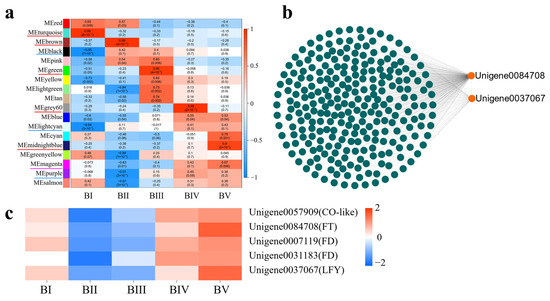 To identify modules specifically associated with each developmental stage, a labeled heatmap was used to analyze the correlation between modules and sample stages. Modules with correlation coefficients above 0.90 and p < 0.01 were considered stage-specific, resulting in the identification of eight specific modules. Notably, the turquoise, brown, green, grey60, and midnightblue modules showed significant positive correlations with BI (dormancy), BII (sprouting), BIII (flower bud primordium formation), BIV (petal differentiation), and BV (completion of petal differentiation), respectively. These are marked with red underlines in Figure 7a. Conversely, the black and lightcyan modules were significantly negatively correlated with BI, and the purple module was negatively correlated with BII, indicated with blue underlines. The DEG information of the top seven KME in these specific modules is shown in Table S4.To explore the functional roles of these modules, GO enrichment analysis was performed on the DEGs within each. In the turquoise module, 1180 GO BP terms were enriched, with 121 GO terms being statistically significant (p < 0.05), including 9 terms related to flowering (p < 0.05). A total of 75 candidate DGEs enriched in these flowering-related terms were identified. Based on the WGCNA network relationships, a co-expression network was built using Cytoscape, revealing two core candidate genes (Table S5, Figure S2a). Applying the same method to other modules, five and three core candidate genes were identified in the brown and green modules, respectively (Tables S6 and S7, Figure S2b,c). However, no core floral initiation-related DEGs were found in the grey60 or midnightblue modules.