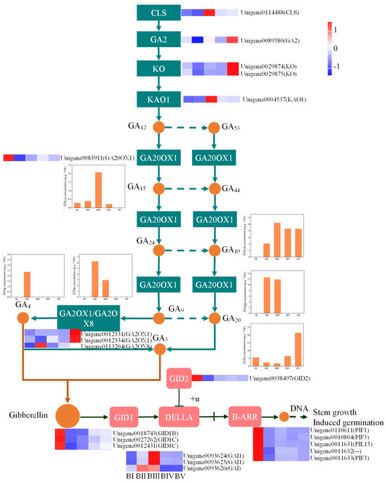 GAs, a class of phytohormones, play a crucial role in floral initiation. KEGG enrichment analysis of DEGs revealed significant enrichment in plant hormone signaling pathways. Therefore, we further analyzed DEGs associated with GA biosynthesis and signal transduction. In the GA biosynthesis pathway, we identified eight DEGs involved in regulating the synthesis of various GAs, including ent-copalyl diphosphate; ent-kaurene; ent-7alpha-hydroxykaur-16-en-19-oic acid; and GA15, GA9, GA19, GA20, GA3, and GA4. In the GA signaling pathway, 12 DEGs were associated with GA signal transduction, namely, 3 GID1, 3 DELLA, 1 GID2, and 5 B-ARR genes.
