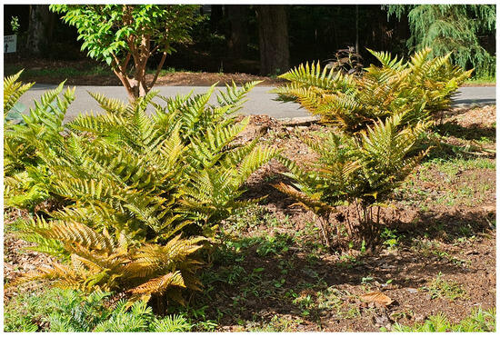 Autumn fern is native to Japan, China, South Korea, and Taiwan [8]. It is extensively planted in residential gardens, in the outdoor spaces of businesses and public parks, and in other settings. It is an appealing horticultural subject because it is fairly large, growing to 1 m tall, is evergreen, has attractive orange- or copper-colored new growth, is pest-free, and requires little to no maintenance or irrigation [9] (Figure 1).