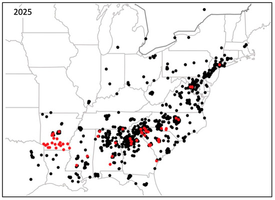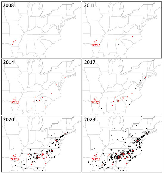 Two kinds of data were used to determine the distribution and abundance of the autumn fern in North America: herbarium collection records of wild-collected specimens and Research Grade iNaturalist posts of the fern (https://iNaturalist.com). iNaturalist is an online citizen science initiative of the California Academy of Sciences and the National Geographic Society, which began in 2008. iNaturalist members post their photographs with GPS locations and times of organisms that are supposed to be occurring naturally, as opposed to being in cultivation. The species in many of the better photographs are identified and designated as Research Grade by specialist curators and knowledgeable members. iNaturalist, with its massive number of observations (>250,000,000 at this writing), is valuable in biodiversity and invasive species research on species that are readily detectable and identifiable in photographs (https://iNaturalist.com) [12,33]. The primary source of herbarium collection records was the Southeast Regional Network of Expertise and Collections (SERNEC) (https://sernecportal.org, 10 May 2025), a consortium of 233 herbaria in the southeastern United States. While many of these herbaria focus on the Southeast, their collections are worldwide. In addition, herbarium collection data of the fern in the five largest herbaria in North America, including the US National Museum of Natural History Herbarium (US), the New York Botanical Garden (NY), the Missouri Botanical Garden (MO), Harvard University’s Grey Herbarium (GH), and the Field Museum of Natural History in Chicago (F) were evaluated on 10 May 2025. The iNaturalist posts of autumn fern used were from the first post in 2010 until the last date of data usage on 8 May 2025. The herbaria of SERNEC and the US National Museum had 76 specimens of D. erythrosora collected from North America. The only herbarium of the five largest herbaria in North America to hold collections of the fern from North America was the US National Museum of Natural History, which had four specimens of the fern. All four were duplicates of collections already accounted for, so a total of 76 herbarium localities and 2553 Research Grade iNaturalist posts were mapped. These collection records and iNaturalist posts were used to create a series of six maps to show the occurrence and distribution of the fern in different time periods, mostly at three-year intervals from 2008, shortly after it was discovered in Arkansas, to 1 October 2023. A seventh map was created to display the currently known distribution of autumn fern as of 16 May 2025.