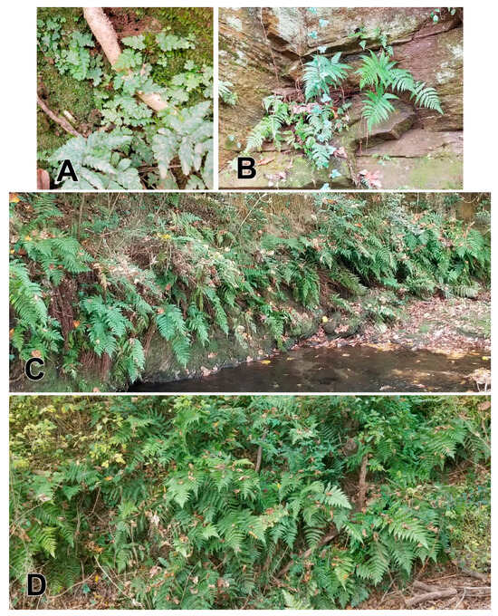 McColloch-Jones et al. [4,5] reported that Dryopteris erythrosora (D.C. Eaton) Kuntze, known as autumn fern in English, is the most marketed of temperate zone ferns as defined by the number of commercial nurseries selling the fern. Due to this high-level market intensity and its recent naturalization in some countries, these authors described it as one of four ferns of particular concern for its potential to spread further and invade. In 2021, Pemberton conducted surveys for plants of McColloch-Jones et al.’s [4,5] four ferns of most concern as potential invaders in the Atlanta/Gainesville region in northern Georgia [7]. In addition to autumn fern, these are Japanese holly fern, Cyrtomium falcatum (L.f.) K. Presl, blackwood fern, Dryopteris cycadina (Franch. & Sav.) C. Chr., and Japanese or Korean tassel fern Polystichum polyblepharon (Roem. ex Kunze) C. Presl. Fifty-eight forest sites in nature preserves and natural situations in parks in eight different counties were surveyed for these ferns. Autumn fern was found at 56 of the 58 sites in seven of the eight counties surveyed. A few months after the survey, autumn fern was found at the 57th site in the eighth county. At half of the sites (28/57) where the fern was found, it was abundant. Autumn fern was also often the most abundant fern at many of these sites and dominated some environments (Figure 4). Many sporelings of the fern commonly grow from gametophytes on clay banks of creeks (Figure 4A). Autumn fern can grow on nearly vertical rock walls (Figure 4B). Infestations of the fern frequently occur along creeks (Figure 4C) and on hillsides in mesic hardwood forests (Figure 4D), where the plants proliferate to the degree that other vegetation is often excluded.