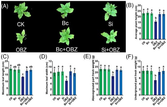 Effects of bamboo biochar (Bc) and sodium silicate (Si) on the growth of tobacco under oxybenzone (OBZ) stress. (A) Representative phenotypes of tobacco seedlings under different treatments. (B–F) Quantitative analysis of growth parameters including (B) average plant height, (C) maximum leaf length, (D) maximum leaf width, (E) aboveground fresh weight, and (F) underground fresh weight. Data are presented as means ± standard deviation (SD, n = 3). Different lowercase letters indicate significant differences among treatments (p < 0.05) according to one-way ANOVA followed by Duncan’s test.