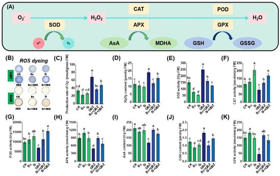 Effects of bamboo biochar (Bc) and sodium silicate (Si) on reactive oxygen species (ROS) accumulation and antioxidant enzyme activities in tobacco under oxybenzone (OBZ) stress. (A) Proposed model of the antioxidant defense system, including the enzymatic and non-enzymatic pathways for ROS scavenging. (B) Histochemical detection of ROS using DAB and NBT staining in leaves under different treatments (visually discernible differences). (C) The generation rate of superoxide anion (O2−). (D) The content of hydrogen peroxide (H2O2). (E) Superoxide dismutase (SOD) activity. (F) Catalase (CAT) activity. (G) Peroxidase (POD) activity. (H) Ascorbate peroxidase (APX) activity. (I) The content of ascorbic acid (AsA) content. (J) The content of reduced glutathione (GSH). (K) Glutathione peroxidase (GPX) activity. Data are presented as means ± standard deviation (SD, n = 3). Different lowercase letters indicate significant differences among treatments (p < 0.05) according to one-way ANOVA followed by Duncan’s test.