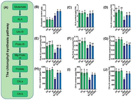 Effects of bamboo biochar (Bc) and sodium silicate (Si) on chlorophyll synthesis and chlorophyll-related metabolites in tobacco under oxybenzone (OBZ) stress. (A) Schematic diagram of the chlorophyll biosynthesis pathway, showing chlorophyll precursors and intermediate metabolites. (B–J) Determination of chlorophyll precursors and pigment contents: (B) glutamic acid, (C) δ-aminolevulinic acid (ALA), (D) uroporphyrinogen III (Uro III), (E) protoporphyrin IX (Proto IX), (F) magnesium protoporphyrin IX (Mg-Proto IX), (G) protochlorophyllide (Pchlide), (H) chlorophyll a (Chl a), (I) chlorophyll b (Chl b), and (J) total chlorophyll (Chl a + b). Data are presented as means ± standard deviation (SD, n = 3). Different lowercase letters indicate significant differences among treatments (p < 0.05) according to one-way ANOVA followed by Duncan’s test.