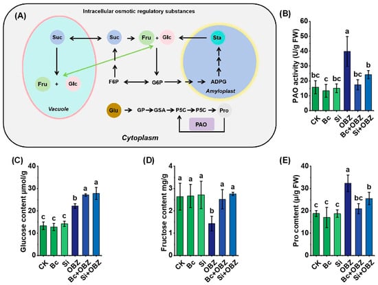 Effects of bamboo biochar (Bc) and sodium silicate (Si) on intracellular osmotic regulation and compatible solute accumulation in tobacco under oxybenzone (OBZ) stress. (A) Schematic illustration of osmotic adjustment pathways and key metabolic intermediates, including sugar conversion and proline biosynthesis. (B) Polyamine oxidase (PAO) activity. (C) Glucose content. (D) Fructose content. (E) Proline (Pro) content. Data are presented as means ± standard deviation (SD, n = 3). Different lowercase letters indicate significant differences among treatments (p < 0.05) according to one-way ANOVA followed by Duncan’s test.