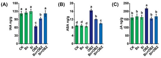 Effects of bamboo biochar (Bc) and sodium silicate (Si) on endogenous hormone levels in tobacco under oxybenzone (OBZ) stress. (A) Indole-3-acetic acid (IAA) content. (B) Abscisic acid (ABA) content. (C) Jasmonic acid (JA) content. Data are presented as means ± standard deviation (SD, n = 3). Different lowercase letters indicate statistically significant differences (p < 0.05) among treatments based on one-way ANOVA followed by Duncan’s multiple range test.