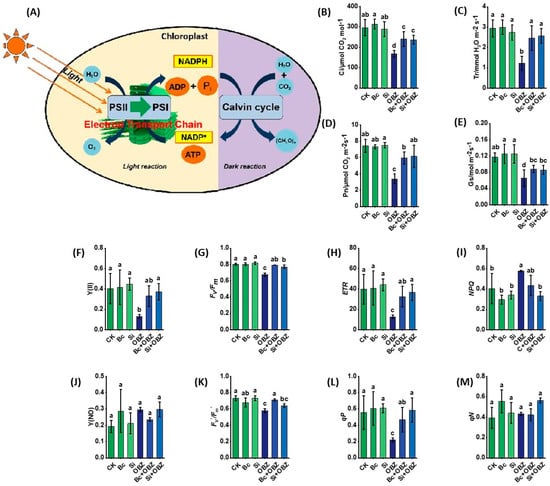 Effects of bamboo biochar (Bc) and sodium silicate (Si) on photosynthetic capacity and chloroplast function in tobacco under oxybenzone (OBZ) stress. (A) Schematic diagram illustrating the light reactions (PSII, PSI, and electron transport chain) and the Calvin cycle within the chloroplast. (B–E) Gas exchange parameters: (B) intercellular CO2 concentration (Ci), (C) transpiration rate (Tr), (D) net photosynthetic rate (Pn), and (E) stomatal conductance (Gs). (F–M) Chlorophyll fluorescence parameters: (F) actual photochemical quantum yield, (G) maximum quantum yield of PSII (Fv/Fm), (H) electron transport rate (ETR), (I) regulated energy dissipation quantum yield, (J) non-regulated energy dissipation, (K) effective photochemical quantum yield, (L) photochemical quenching coefficient, and (M) non-photochemical quenching coefficient. Data are presented as means ± standard deviation (SD, n = 3). Different lowercase letters indicate significant differences among treatments (p < 0.05) according to one-way ANOVA followed by Duncan’s test.