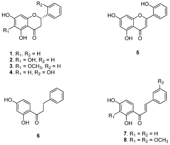 From A. africanum total extract, eight pure compounds (1–8, Figure 1) were isolated and identified, namely: 2(S)-5,7-dihydroxyflavanone (1) [4]; 2(S)-5,6,7-trihydroxyflavanone (2); and 2(S)-5,7-dihydroxy-6-methoxyflavanone (3), previously isolated from Scutellaria baicalensis [12]. and Helichrysum cymosum [13]. Compounds 2 and 3 are reported here for the first time from this plant. Additional compounds include 2(S)-2′,5,7-trihydroxyflavanone (4) [4,8]; 2′,5,7-trihydroxyflavone (5) [14,15]; 2′,4′-dihydroxydihydrochalcone (6) [4]; and 2′,4′-dihydroxychalcone (7) [8] all previously reported from the same source (Table S1, and Figures S1–S7). Notably, (E)-2′,4′-dihydroxy-3,3′-dimethoxychalcone (8) is reported here for the first time. As shown in Table 1, the NMR data of compound 8 in DMSO-d6 reveals significant spectral characteristics.