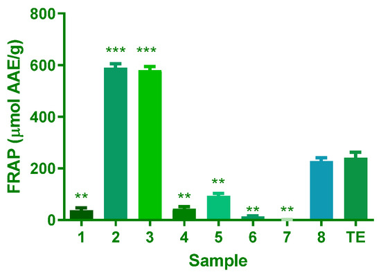The ferric reducing antioxidant potential (FRAP, µM AAE/g) of samples isolated from A. africanum. Results are expressed as mean and SD of triplicate evaluations (n = 3). For the significant difference in compounds 1–8 vs. TE at p < 0.05, ** for p ≤ 0.01, and *** for p ≤ 0.001.