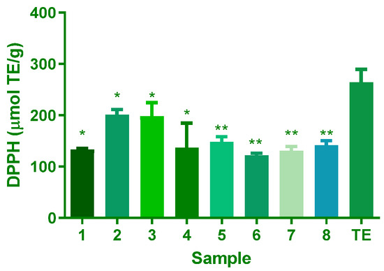 Antioxidant capacity of A. africanum isolates using the DPPH method (µmol TrE/g). Results are expressed as mean and SD of triplicate evaluations (n = 3). For the significant difference in compounds 1–8 vs. TE at p < 0.05, * for p ≤ 0.05 and ** for p ≤ 0.01.