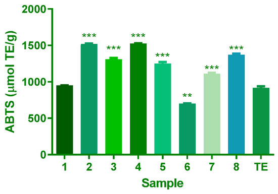 The relative antioxidant ability of isolates from A. africanum to scavenge the radical ABTS+. Results are expressed as Trolox equivalents (µmol TrE/g), mean, and SD of triplicate evaluations (n = 3). For the significant difference in samples 1–8 vs. TE at p < 0.05, ** for p ≤ 0.01, and *** for p ≤ 0.001.