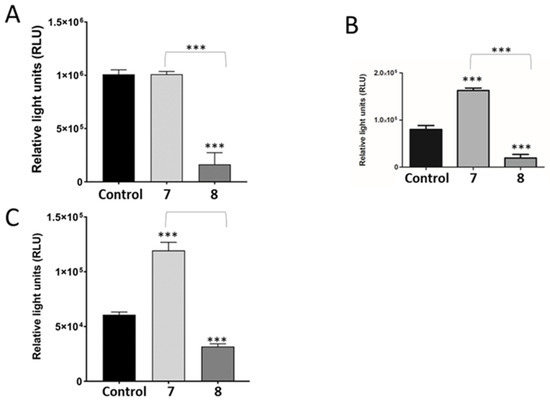 Test compounds significantly influenced apoptotic cell death markers. The activity of initiator caspase 8 (A) was significantly downregulated by compound 8. Caspase 9 activity (B) was significantly elevated by 7 with a concomitant increase in the executioner caspase 3 activity (C), (n = 3). *** p < 0.001.