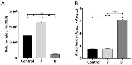 Treatment with 7 did not alter caspase-8 activity, while 8 significantly decreased activity (Figure 5A). The activity of mitochondria-mediated apoptotic cell death initiator caspase-9 was significantly increased in 7 but not 8. These data indicate that only compound 7 triggered the intrinsic pathway and activation of caspase 3 (Figure 5B).