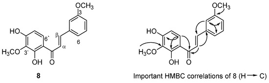 The HMBC correlations showed cross peaks between (among others) H-2 and C-1, C-3, C-β, C-6, C-4; H-α/C-1, CO, C1′; and H-6′/C-4′, CO, C-2′ which confirm the connections among ring A and ring B carbons and with the 1,4-enone system of the chalcones structure. The positions of the methoxy groups at C-3 and C-3′ were confirmed by the HMBC correlation of the methoxy protons with the same carbons (Figure 8). Further, the NMR data are similar to (E)-3,2′,4′-trihydroxy-3′-methoxychalcone isolated from the same source [8]; the only difference is the presence of a methoxy group at C-3′ in 8. The structure of 8 was deduced to be the new (E)-2′,4′-dihydroxy-3,3′-dimethoxychalcone.