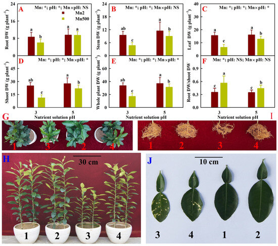 Effects of Mn-pH treatments on the mean (±SD, n = 10) root DW (A), stem DW (B), leaf DW (C), shoot DW (D), whole plant DW (E), and root DW/shoot DW ratio (F), as well as growth (G–J) of ‘Sour pummelo’ seedlings. The bars with different letters indicate significant differences at p ≤ 0.05. pH: NS, and Mn × pH: NS indicate that the F values for pH and Mn × pH are not significant (p > 0.05). Mn: *, pH: *, and Mn × pH: * indicate that the F values for Mn, pH, and Mn × pH are significant at p ≤ 0.05. 1, Mn2 + P3; 2, Mn2 + P5; 3, Mn500 + P3; and 4, Mn500 + P5.
