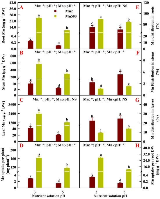 The research showed that Mn500 elevated Mn concentrations in roots, stems, and leaves; Mn distribution in roots; Mn uptake per plant (UPP); and Mn uptake per root DW (UPR), but it reduced Mn distributions in stems and leaves. Low pH enhanced Mn concentrations in roots, stems, and leaves, Mn distribution in roots, Mn UPP, and Mn UPR, but it lowered Mn distributions in stems and leaves. The only exception was that Mn distributions in leaves at Mn2 were not affected by pH treatments (Figure 2).