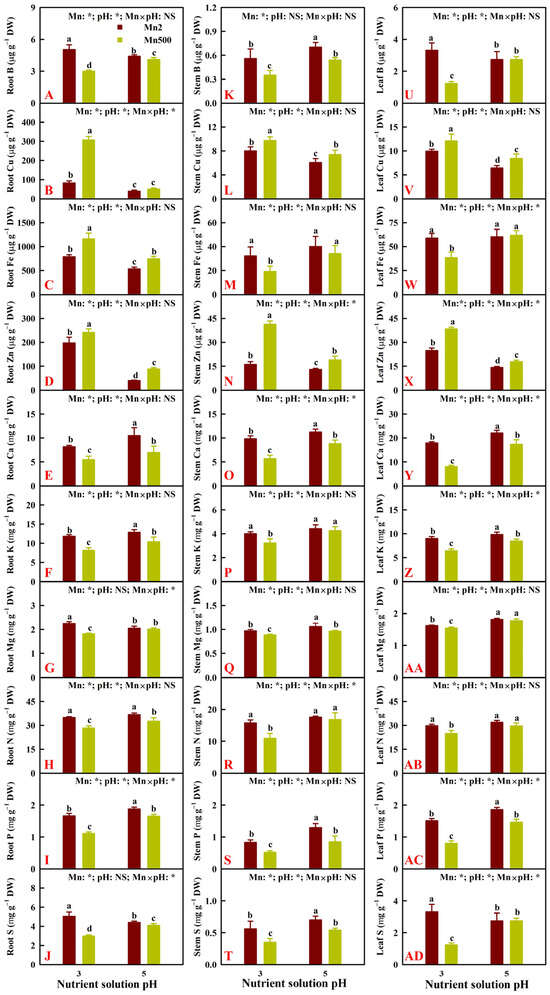 Effects of Mn-pH treatments on the mean (±SD, n = 4) concentrations of B, Cu, Fe, Zn, Ca, K, Mg, N, P, and S in roots (A–J), stems (K–T), and leaves (U–AD) of ‘Sour pummelo’ seedlings. The bars with different letters indicate significant differences at p ≤ 0.05. pH: NS and Mn × pH: NS indicate that the F values for pH and Mn × pH are not significant (p > 0.05). Mn: *, pH: *, and Mn × pH: * indicate that the F values for Mn, pH, and Mn × pH are significant at p ≤ 0.05.