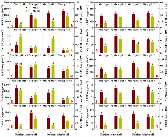 Effects of Mn-pH treatments on the mean (±SD, n = 4) nutrient uptake per plant (UPP, (A–J)) and uptake per root dry weight (UPR, (K–T)). The bars with different letters indicate significant differences at p ≤ 0.05. Mn: NS, pH: NS, and Mn × pH: NS indicate that the F values for Mn, pH, and Mn × pH are not significant (p > 0.05). Mn: *, pH: *, and Mn × pH: * indicate that the F values for Mn, pH, and Mn × pH are significant at p ≤ 0.05.